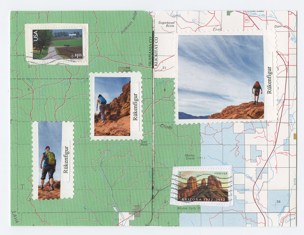 The first page of my Mail/Art/Book entry, with Rükenfigur stamps.